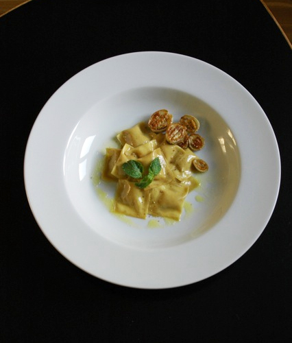 In dieser Ausgabe: Butternut-Kürbis-Ravioli mit Minze, Zitronenbutter und frittierter, weisser Aubergine und Salat mit Ei: