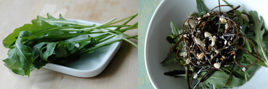 - 3. Layer rucola, than arame at the bottom of the a bowl. Sprinkle pine nuts on top.