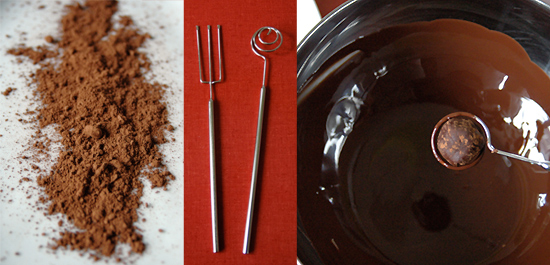 In this order, have ready (from left to right): a plate of cacao powder, a fork or spiral scoop, the melted 72% chocolate & a baking tray lined with parchment paper.